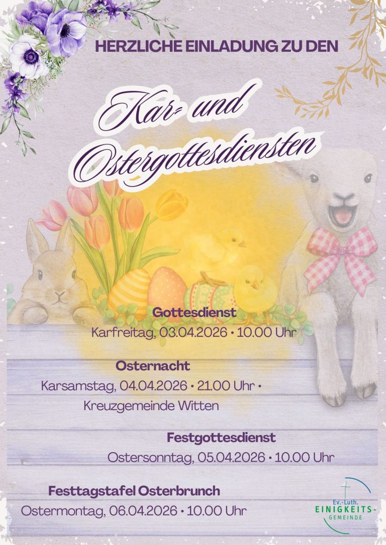 Die Ev.-Luth. Einigkeits-Gemeinde lädt Euch herzliche zu den Gottesdiensten in der Kar- und Osterwoche ein. Die Gottesdienste finden im Gemeindesaal auf dem Lutherhof statt. Weitere Informationen entnehmt bitte dem abgebildeten Flyer.