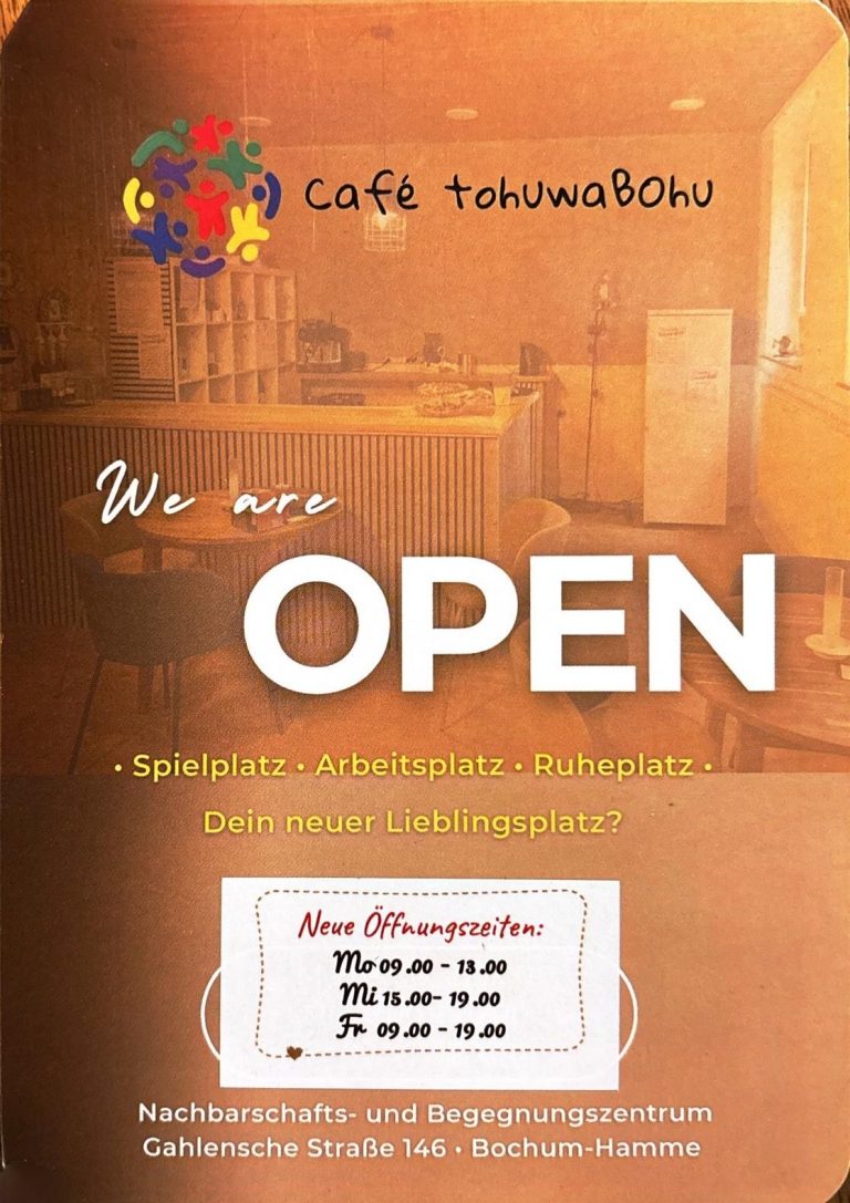 Seit dem 06.09.2025 ist das Nachbarschafts- und Begegnungszentrum "Café tohuwaBOhu" eröffnet und bietet den Menschen aus Bochum fortan einen Ort der Begegnung. Das Café wird durch ein ehrenamtliches Team betreut. Die aktuellen Öffnungszeiten, aktuelle Veranstaltungen und Angebote werden an dieser Stelle veröffentlicht.