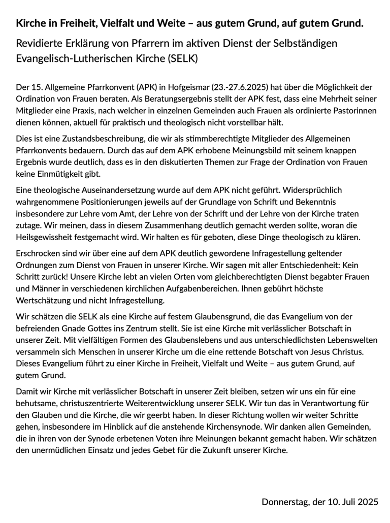 Einzelne Formulierungen der Erklärung vom 04.07.2025 sind so verstanden worden, als sollten theologische Gespräche und Fragen durch eine Lehrverurteilung beendet werden. - Das Gegenteil ist der Fall. Eine Lehrverurteilung haben wir nicht aussprechen wollen. Auch die Kirchengemeinschaft haben wir niemanden aufgekündigt. Für die missverstehbaren Formulierungen bitten wir um Entschuldigung. Das lag und liegt nicht in unserer Absicht.